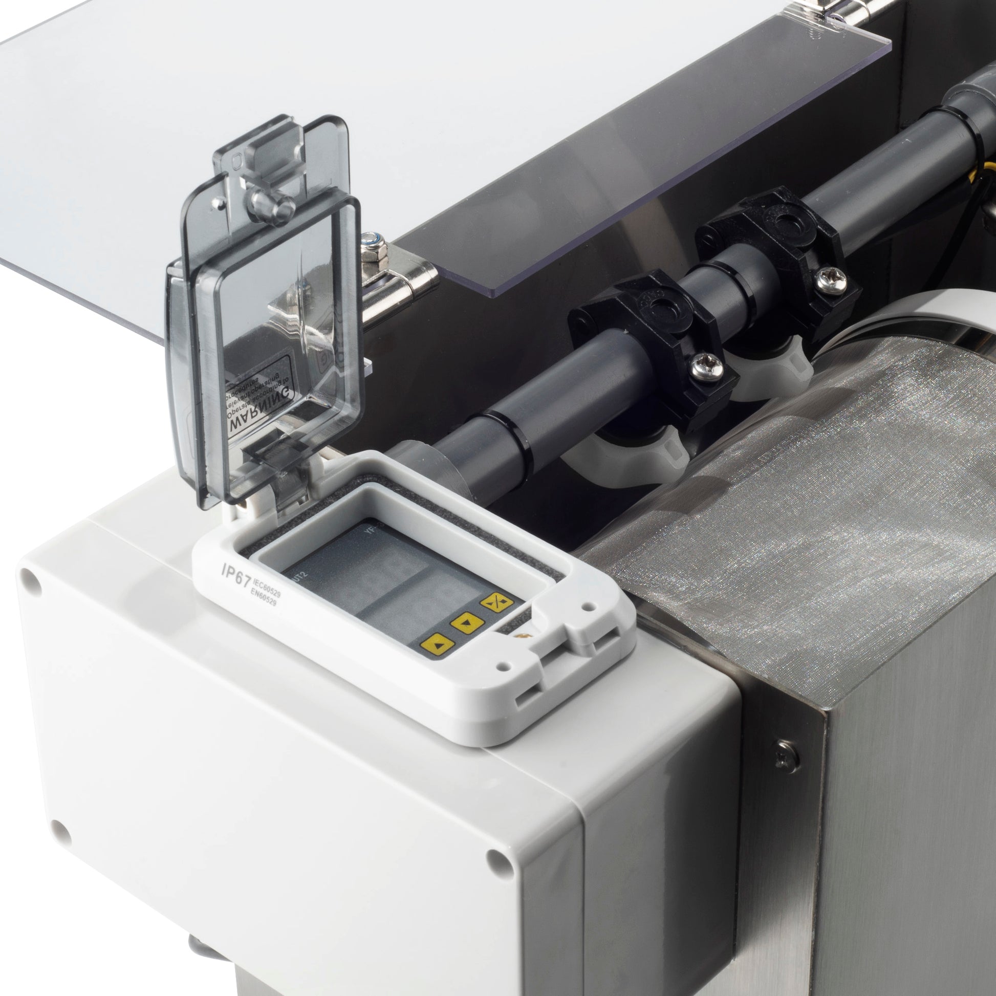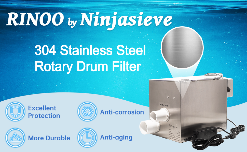 NinjaSieve Rotary Drum Filter 4T10-1 (RDF) effectively filters out fish food residues, sewage, fish waste, algae and debris, helping to clean the fish pond water and greatly reducing the maintenance stress on the biochemical filtration module; the maximum water flow rate of the filter is 1500 l/h. There is a sewage receiving trough inside the drum, the fish pond water flows into the filter through the inlet pipe, the impurity particles in the water are separated through the 74 μm screen , and the nozzles sprays the impurities attached to the sieve down to sewage receiving trough, which is discharged by the sewage pipe.
