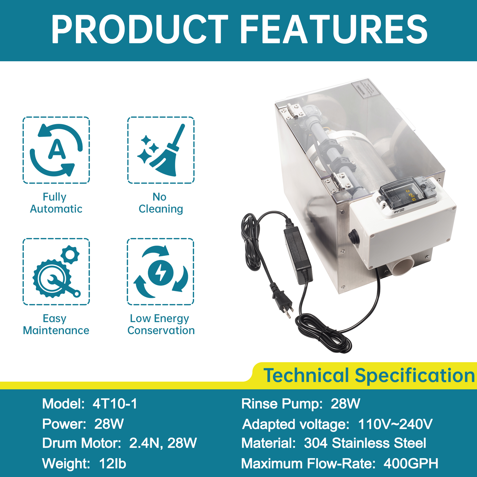 NinjaSieve RDF Automatic Drum Filter for Koi Tilapia Pond, Aquarium, Hydroponics, Aquaponics, Smallest RDF Koi Pond Filter 4T10-1 (400GPH)